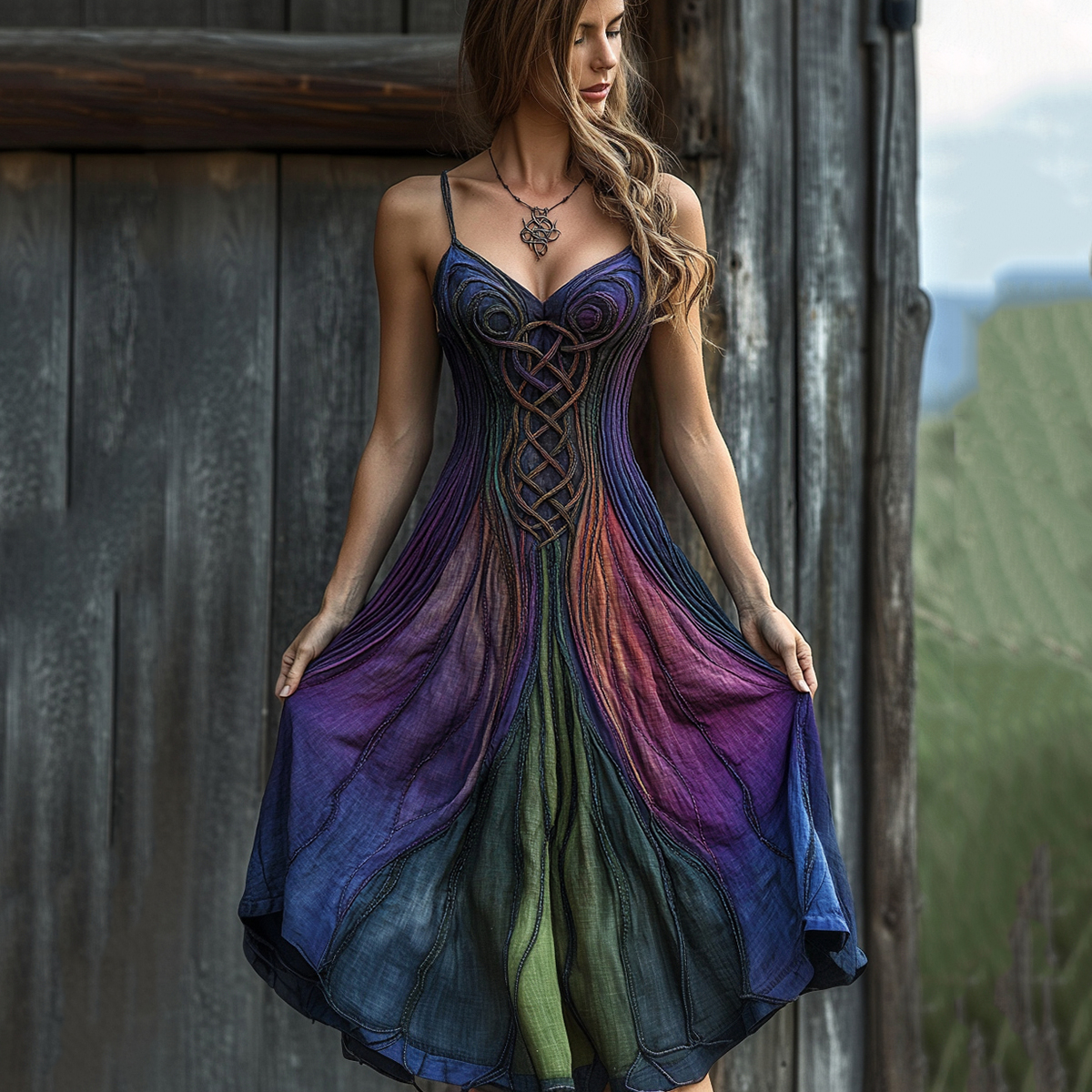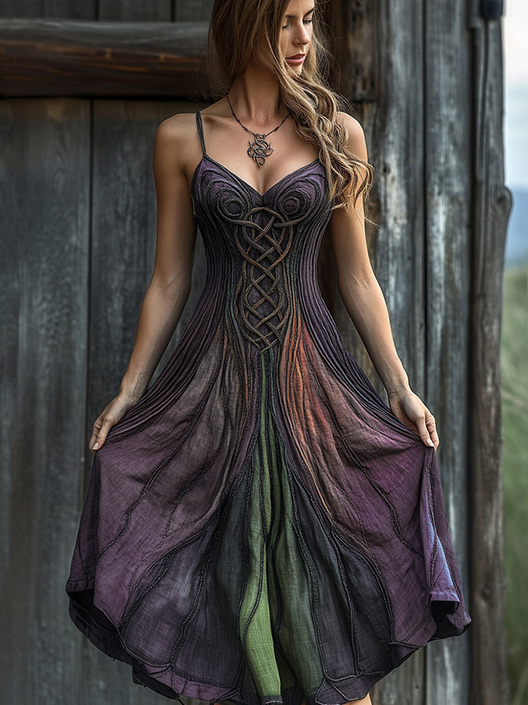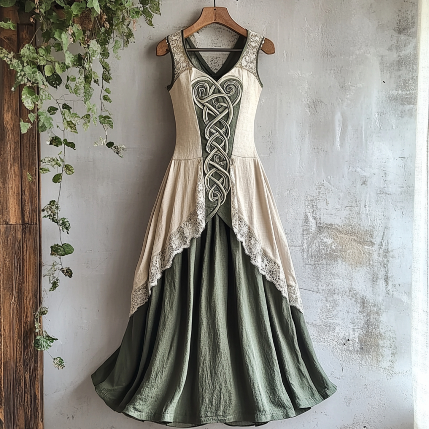 Vintage Viking Tribal Celtic Knot Art Linen V-neck Maxi Dress